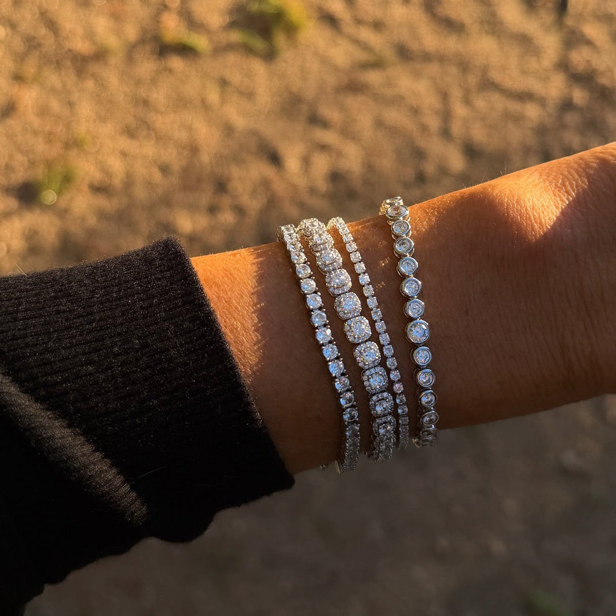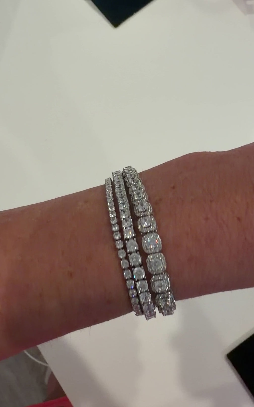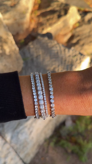 Each link features a radiant cushion cut diamond with a halo of round diamonds surrounding it